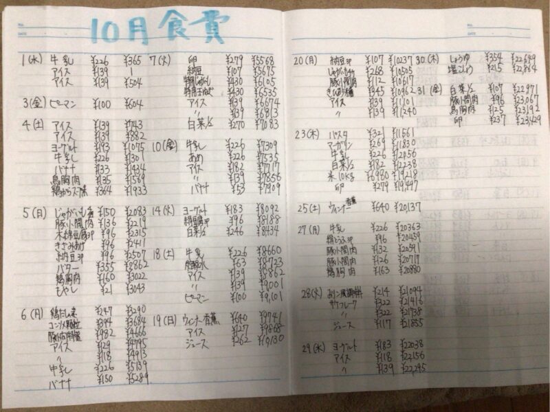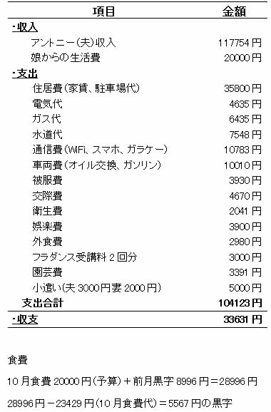 10月の家計簿です。今月もアントニー頑張りました。11万!!家計大助かりです(^^♪