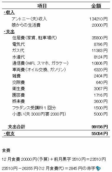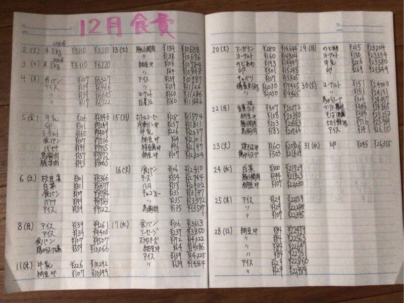 クリノンの家計簿(2025年12月) クリノンの日記 2026.01.13 この記事は約1分で読めます。 12月の家計簿です。 今月のアントニー収入は今までの中で一番多い13万円超えました(#^.^#) 黒字5万円(^^♪貯めて家族旅行に行こうかと思います!! 食費は月初めにドラックストアで20%引き券を使い二袋購入して今月はこれで乗り切る予定でしたが、なんと備蓄米がまた売られていたので二袋購入してしまいました。2845円の赤字になってしまいましたが、1月はお米を買わなくてすみそうなので1月で調整です。