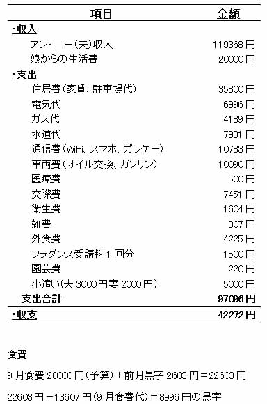今月は敬老の日で両親をレストランに連れて行ったり、車のオイル交換があったりでどうかなと思いましたが、アントニーの収入だけでやっていけました(^^♪
