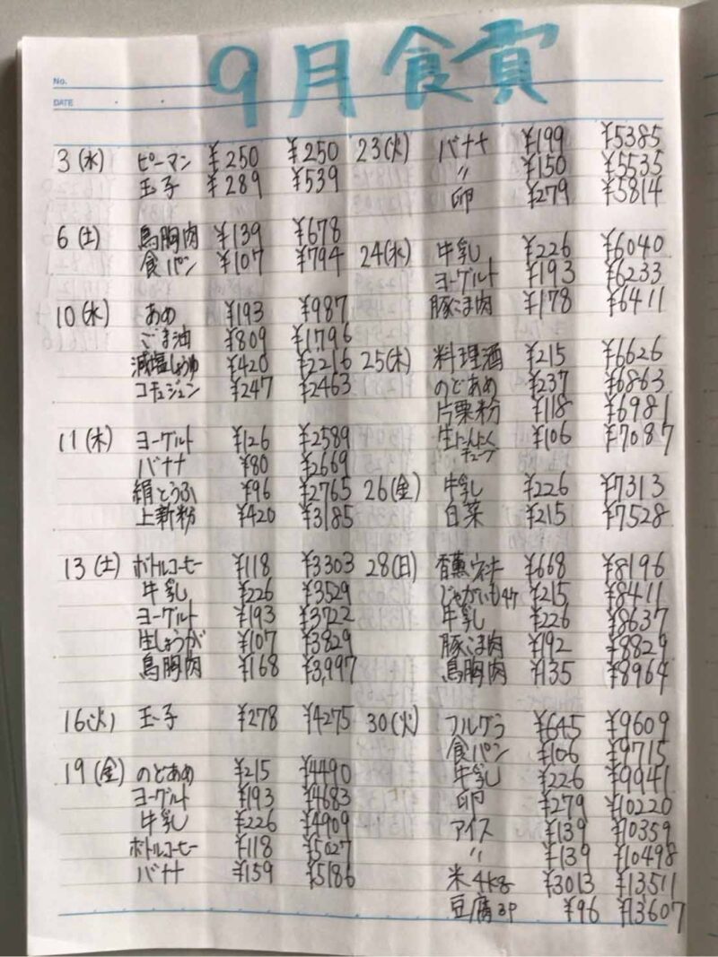 9月の家計簿です。