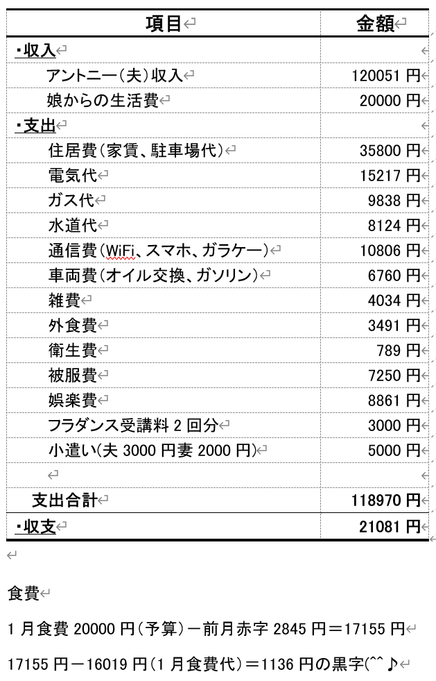やはり電気代が前月の倍になってしまいました。ただ、アントニーの収入が今月も10万円超えて12万円でしたので先月とまではいきませんでしたが、今月も黒字で頑張りました。